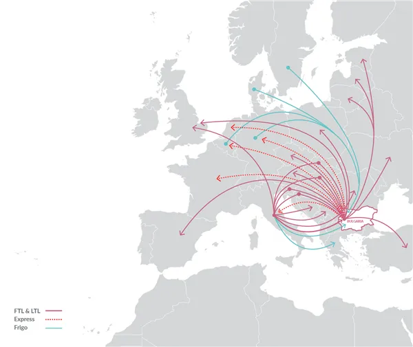 Нашият транспорт на стоки от и до България се основава на стабилна европейска мрежа, която гарантира бързи и надеждни доставки към основните пазари. Ежедневно управляваме пратки между България и Италия, Германия, Нидерландия и Белгия, както и редовни линии към Испания, Полша и основните дестинации в Централна Европа, като осигуряваме фиксирано транзитно време e и стабилно обслужване по най-натоварените търговски маршрути.